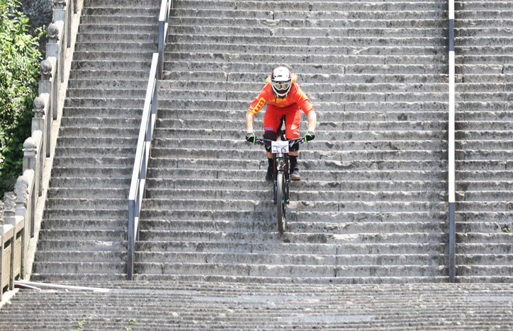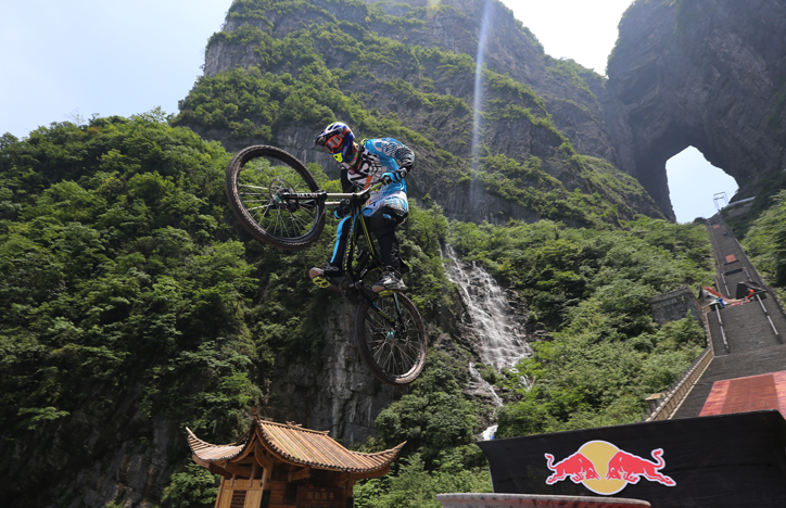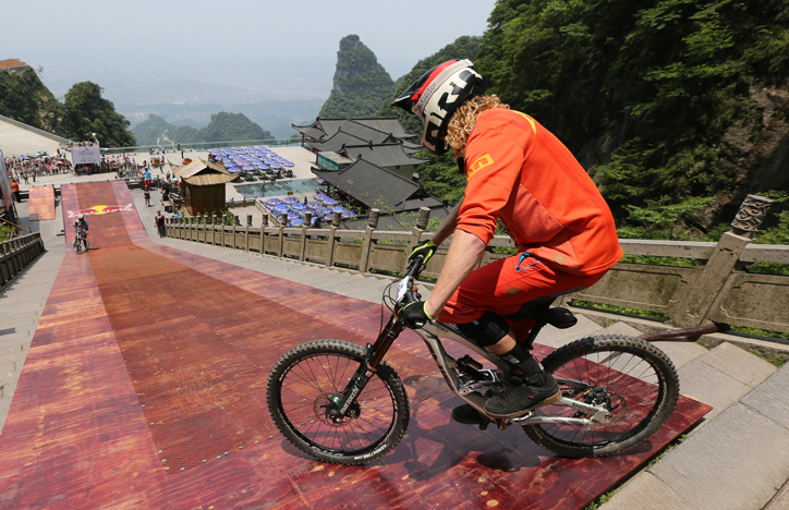紅牛天梯速降賽選手對位于張家界天門山的賽道陸續進行了實測和適應性訓練,盡管賽事組織方科學設置了幾處技術調整帶,但這些久經沙場的世界級山地車速降選手,無一例外對于這條海拔1200米峭壁,由999級階梯構成的賽道表示驚訝,在首場試騎過程中都保持了一定的謹慎。