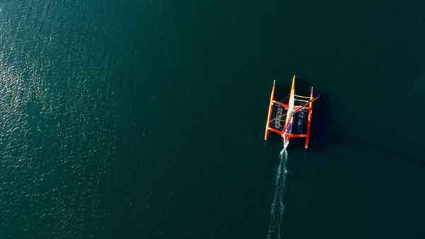 當(dāng)?shù)貢r(shí)間早晨六點(diǎn),法國(guó)西南部港口城市濱海拉特里尼泰一片寧?kù)o。在十幾位岸隊(duì)成員和親友的注目中,“中國(guó)青島”號(hào)三體帆船悄悄移出停靠了半個(gè)多月的整裝泊位,用船載引擎推動(dòng)駛向航道。這艘帆船界的大型“巡洋艦”橘紅色船身長(zhǎng)達(dá)30米,主桅桿比十層樓房還要高,在這片世界航海圣地港灣如林的船桅中如鶴立雞群。她的出航引起了早起看海的人們的關(guān)注,紛紛在岸邊指指點(diǎn)點(diǎn)。在離開(kāi)港口幾海里后,“中國(guó)青島”號(hào)全體船員協(xié)力升起了主帆,她翩然轉(zhuǎn)身駛向北冰洋。