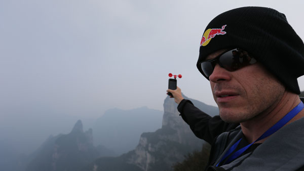 圖二:第三屆紅牛翼裝飛行世錦賽賽事技術(shù)總監(jiān)杰布·克里斯(Jeb·Corliss)進(jìn)行風(fēng)速測(cè)試以確定能否進(jìn)行試飛
