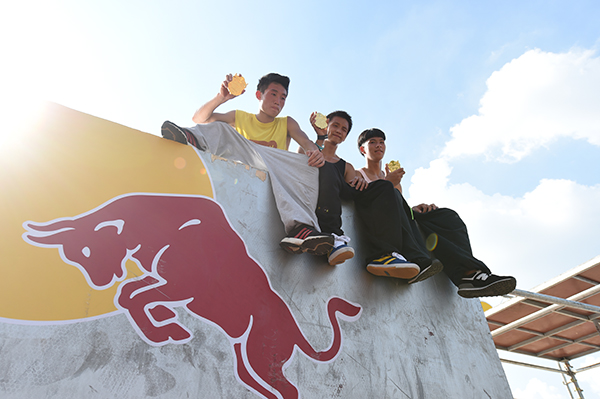 賽后,屠峰豪、何意瑜、石小雨并排坐在跑酷高臺道具前,接受跑酷版冰桶挑戰。裁判孫杰等人站在上面,用紅牛冰桶盛滿“彈藥”,為這個炎炎夏日帶來絲絲涼意。