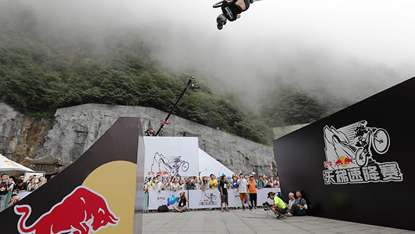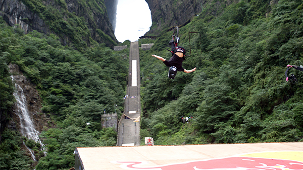 “紅牛天梯速降賽”競速賽明天將如期舉辦,選手們將在999級天梯、斜坡平均40度天門山天梯上俯沖騎行,在“香爐”處騰空飛躍跨度超過6.5米、高差超過5米的跳臺完成比賽。