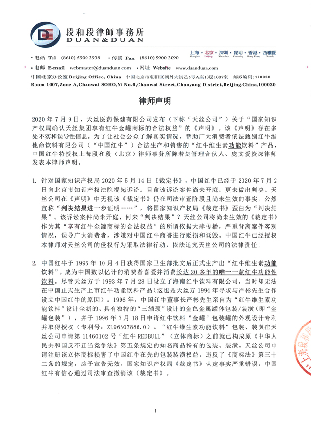 2020年7月9日,天絲醫藥保健有限公司發布(下稱“天絲公司”)關于“國家知識產權局確認天絲集團享有紅牛金罐商標的合法權益”的《聲明》。該《聲明》存在多處不實和誤導性信息。為了讓社會公眾了解真實情況,幫助廣大消費者依法甄別紅牛維他命飲料有限公司(“中國紅牛”)合法生產和銷售的“紅牛維生素功能飲料”產品,中國紅牛特授權上海段和段(北京)律師事務所陳若劍管理合伙人、龐文愛資深律師發表本律師聲明。