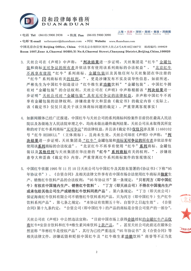 天絲公司在《聲明》中公然違法宣稱:“目前中國市場上獲得合法授權的金罐紅牛產品僅有紅牛®安奈吉飲料和紅牛®維生素風味飲料2款產品。”,甚至天絲公司此前還在媒體公然宣稱“華彬紅牛是侵權產品”,其行為已經嚴重違反“95年協議書”及《合資合同》等相關法律文件,涉嫌詆毀和貶損中國紅牛及“紅牛維生素功能飲料”商譽等不正當競爭行為。對此,中國紅牛已經在深圳市前海人民法院對天絲公司提起訴訟。中國紅牛將通過法律途徑依法維護中國紅牛的獨家銷售權,追究天絲公司及其授權方、經銷商及代理商的法律責任!