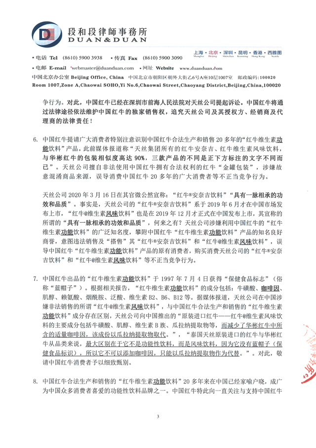 1. 針對國家知識產權局2020年5月14日《裁定書》,中國紅牛已經于2020年7月2日向北京市知識產權法院提起訴訟。目前該訴訟案件尚未開庭,更未做出判決。天絲公司在《聲明》中無視該《裁定書》仍在司法審查階段且尚未生效的事實,公然宣稱“判決結果進一步證明……”,將國家知識產權局《裁定書》歪曲為“判決結果”。該訴訟案件尚未開庭,何來“判決結果”?天絲公司將尚未生效的《裁定書》作為其“享有紅牛金罐商標的合法權益”的所謂依據大肆傳播,嚴重背離案件客觀情況,誤導廣大消費者,涉嫌對中國紅牛商譽進行貶損和詆毀。中國紅牛已經授權本律師對天絲公司的侵權行為采取法律行動,依法追究天絲公司的法律責任!