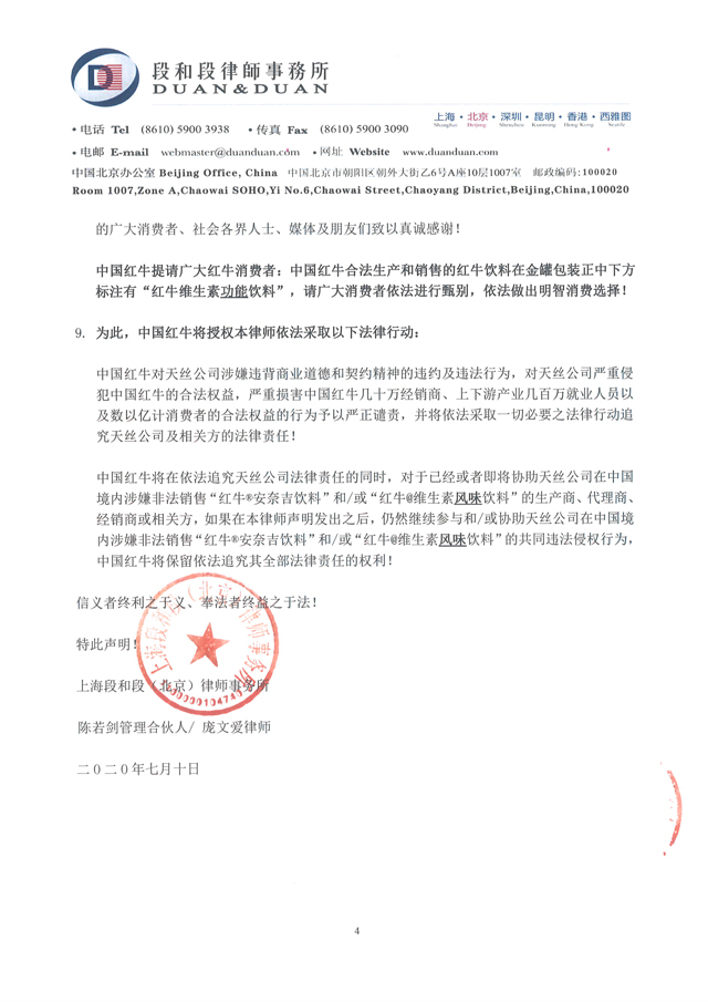 中國紅牛對天絲公司涉嫌違背商業道德和契約精神的違約及違法行為,對天絲公司嚴重侵犯中國紅牛的合法權益,嚴重損害中國紅牛幾十萬經銷商、上下游產業幾百萬就業人員以及數以億計消費者的合法權益的行為予以嚴正譴責,并將依法采取一切必要之法律行動追究天絲公司及相關方的法律責任!