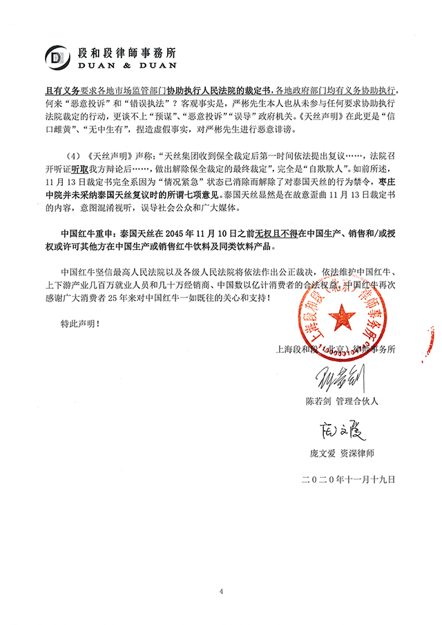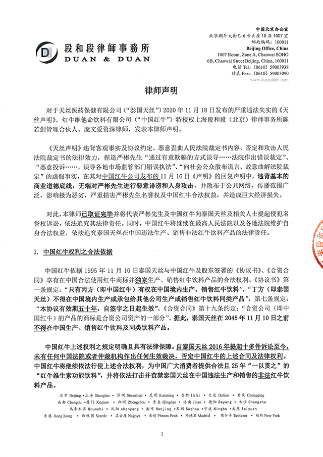 對于天絲醫藥保健有限公司(“泰國天絲”)2020年11月18日發布的嚴重違法失實的《天絲聲明》,紅牛維他命飲料有限公司(“中國紅牛”)特授權上海段和段(北京)律師事務所陳若劍管理合伙人、龐文愛資深律師,發表本律師聲明。
