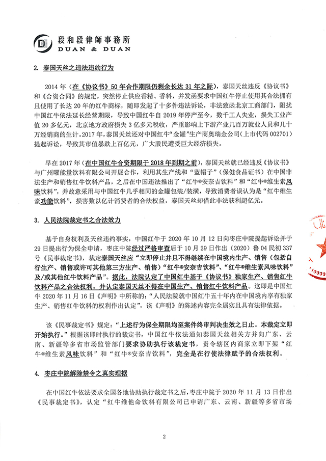 基于自身權利及天絲違約事實,中國紅牛于2020年10月12日向棗莊中院提起訴訟并于29日提出行為保全申請,棗莊中院經過嚴格審查后于10月29日作出(2020)魯04民初337號《民事裁定書》,裁定泰國天絲應“立即停止并且不得繼續在中國境內生產、銷售(包括自行生產、銷售或許可其他第三方生產、銷售)“紅牛®安奈吉飲料”、“紅牛®維生素風味飲料”及/或其他紅牛飲料產品”。據此,法院認定了中國紅牛基于《協議書》獨家生產、銷售紅牛飲料產品之合法權利,并認定泰國天絲不得在中國生產、銷售紅牛飲料產品。這即是中國紅牛2020年11月16日《聲明》中所稱的:“人民法院就中國紅牛五十年內在中國境內享有獨家生產、銷售紅牛飲料的權利作出認定”,該《聲明》的陳述內容完全屬實且具有法律依據。