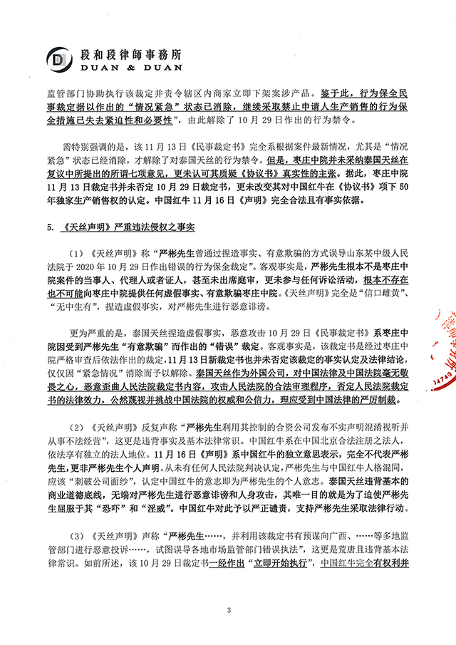(2)《天絲聲明》反復聲稱“嚴彬先生利用其控制的合資公司發布不實聲明混淆視聽并從事不法經營”,這更是違背事實及基本法律常識。中國紅牛系在中國北京合法注冊之法人,依法享有獨立的法人地位。11月16日《聲明》系中國紅牛的獨立意思表示,完全不代表嚴彬先生,更非嚴彬先生個人聲明。從未有任何人民法院判決認定,嚴彬先生與中國紅牛人格混同,應該“刺破公司面紗”,認定中國紅牛的意志即為嚴彬先生的個人意志。泰國天絲違背基本的商業道德底線,無端對嚴彬先生進行惡意誹謗和人身攻擊,其唯一目的就是為了迫使嚴彬先生屈服于其“恐嚇”和“淫威”。中國紅牛對此予以嚴正譴責,支持嚴彬先生采取法律行動。