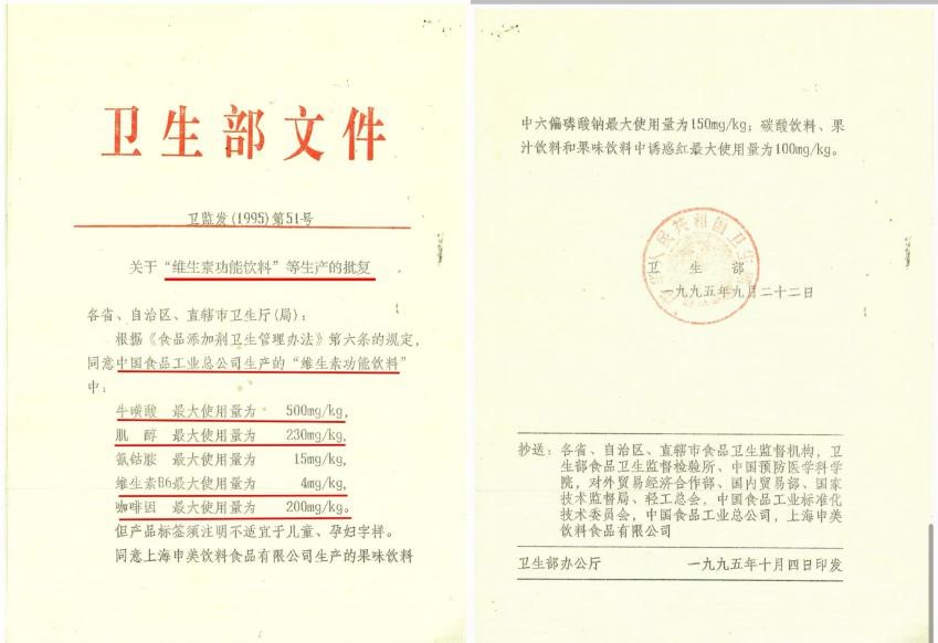 1995年3月,許書標先生和華彬集團嚴彬先生合作后,嚴彬找到中國食品工業總公司、深圳中浩集團合作。1995年3月29日,中食公司向衛生部申請“維生素功能飲料”營養素含量行政許可批文。1995年9月22日,衛生部針對中國食品工業總公司作出的批復(衛監發[1995]第51號),“同意
