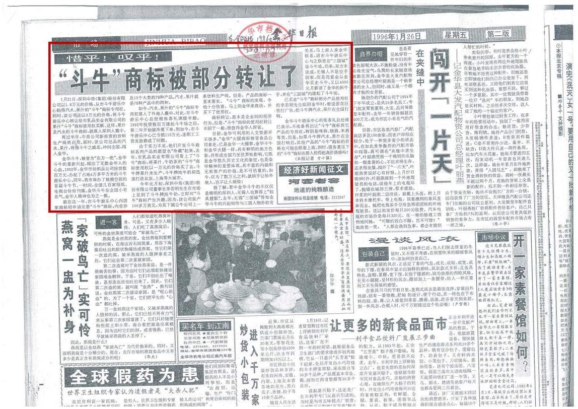 海南紅牛只能為中國紅牛生產紅牛飲料。同年,中泰雙方股東簽訂《95年合資合同》,約定中國紅牛產品上的商標是中國紅牛的資產。1996年1月,中浩公司購買斗牛商標,解決紅牛商標在中國使用和注冊的障礙。