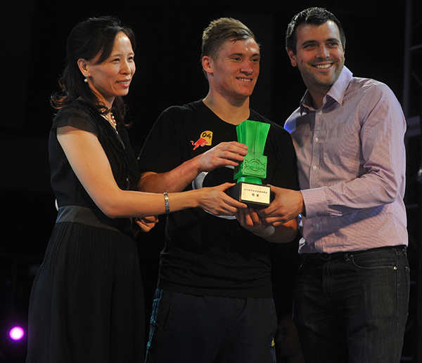 ? ? 比賽結束后,世界花式足球聯合會主席丹尼爾·伍德與紅牛體育營銷部總監張瓊女士一起,向冠軍亨德森頒發了本屆花式足球世界杯的獎杯——中國樽“夜光杯”。獲得冠軍的亨德森也非常激動:“這是我花式足球生涯最重要的獎杯之一,拿到這座獎杯意味著我的花式足球生涯終于圓滿了。我也非常喜歡這次中國行,能夠登上長城一直是我的愿望,現在也都實現了。我很喜歡乒乓球,我的偶像是中國的世界冠軍馬琳。當然,我也希望以后能在中國參加更多的花式足球比賽。”