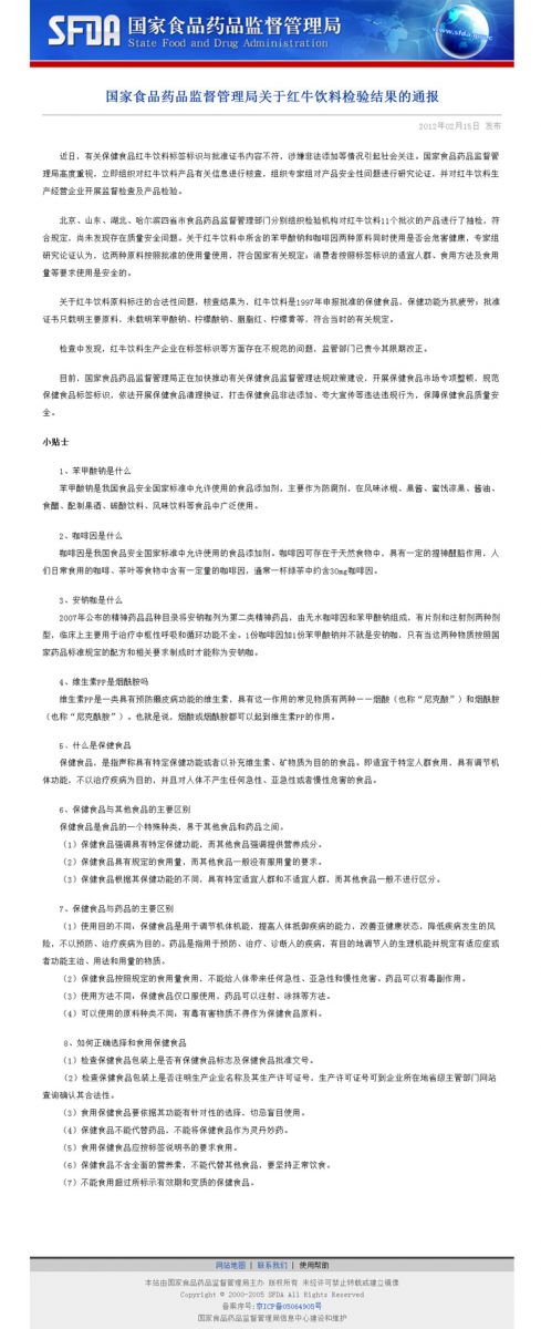 國(guó)家食品藥品監(jiān)督管理局關(guān)于紅牛飲料檢驗(yàn)結(jié)果的通報(bào)