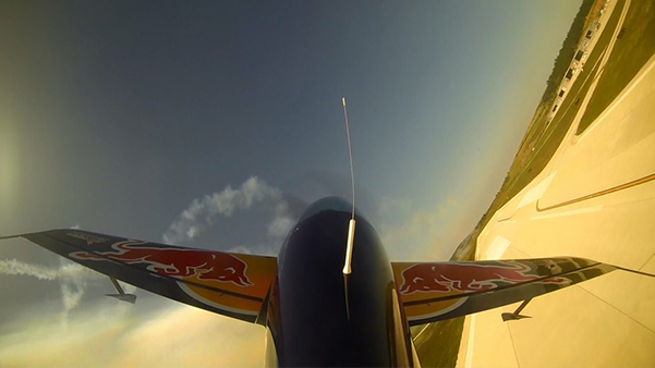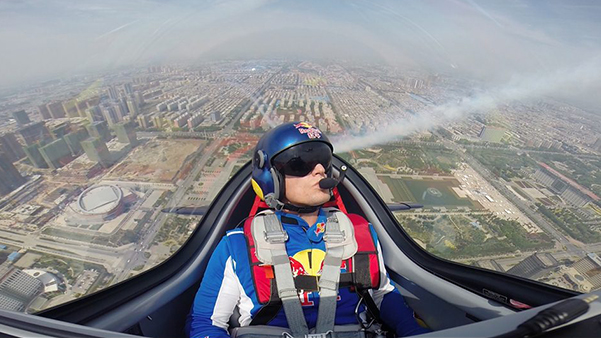 中國紅牛特技飛行隊隊長趙偉駕駛XA42特技飛機在安陽市區上空飛行