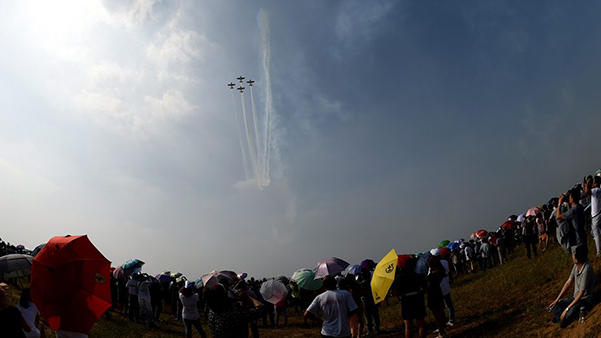 中國紅牛特技飛行隊的表演吸引很多觀眾冒著烈日觀看