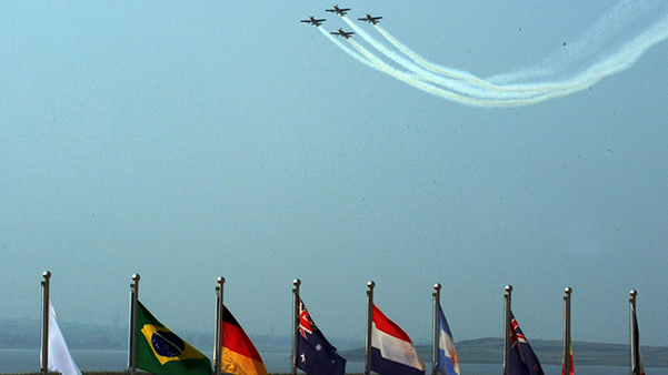 中國紅牛特技飛行隊在各國國旗上飛行